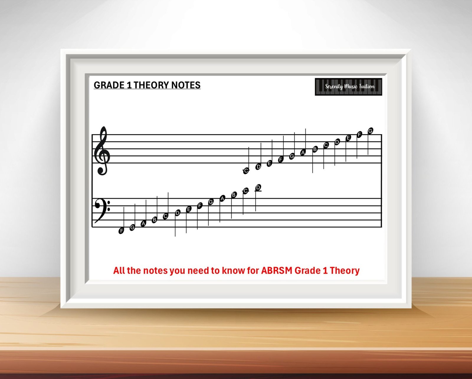 These are all the notes you need to know for ABRSM grade 1 theory. It downloads as a PDF prints out on one page of A4. The frame on the photo is just for visual effect and is not shown on the printed copy.